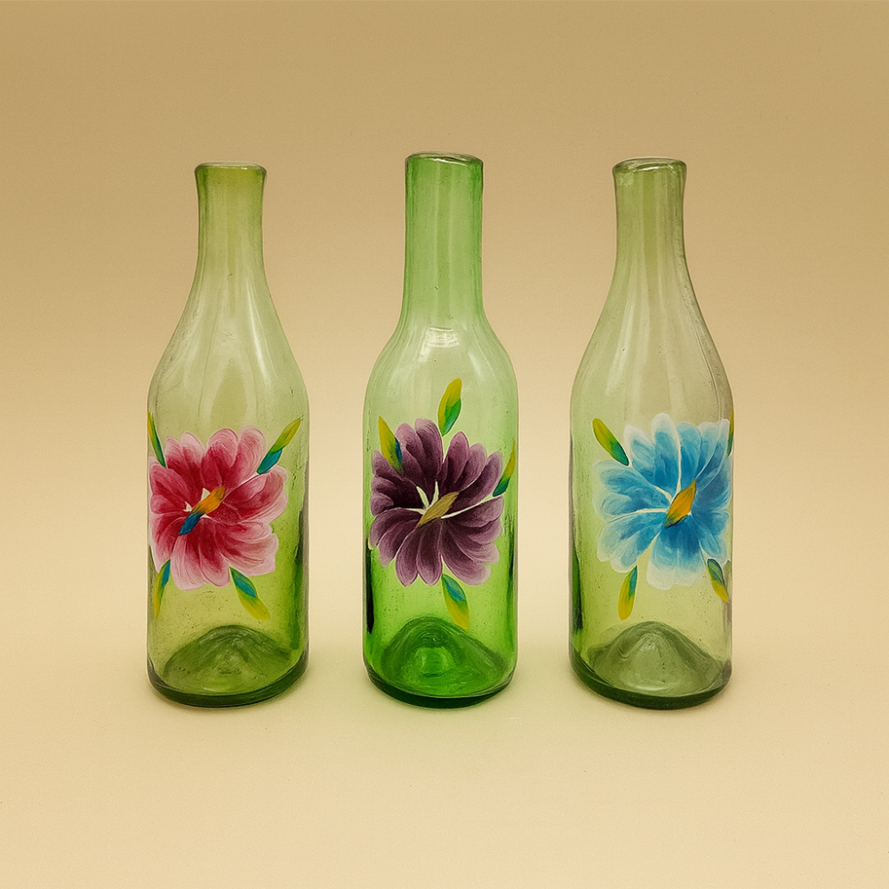 Esta botella de vidrio soplado es una auténtica obra de arte, pintada a mano con detalles únicos, es perfecta para decorar tus espacios o como recipiente especial.