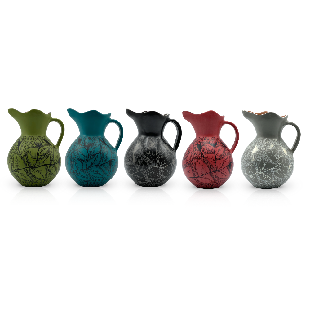 Jarra de barro hecha y pintada a mano con minuciosos diseños botánicos que envuelven su silueta redondeada. Cada pieza destaca por su borde ondulado y acabado artesanal. Una jarra sólida y con gran presencia, perfecta para llevar un toque de tradición y arte popular a la mesa diaria.