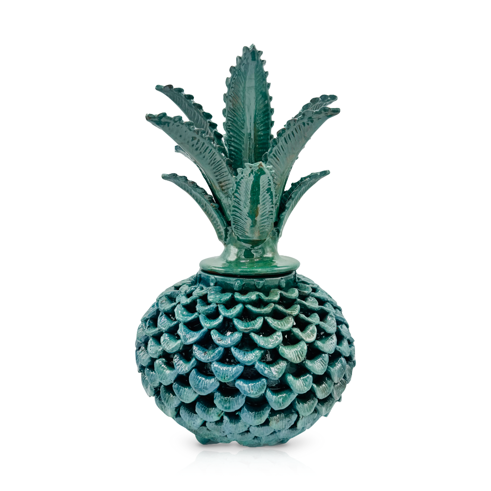 Esta piña decorativa está elaborada en barro vidriado, una técnica tradicional de Michoacán, es una pieza única que añade un toque artesanal y cultural a tus espacios.