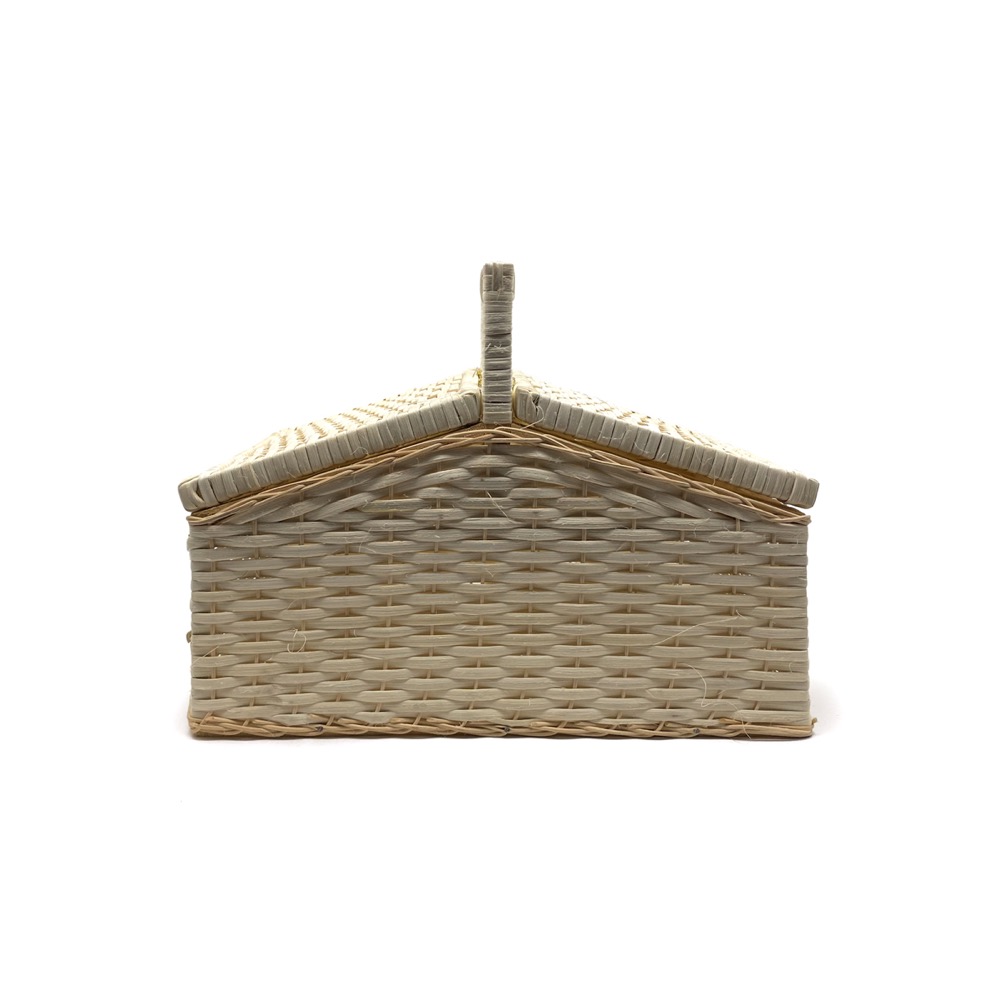 Esta canasta para picnic combina una estructura de madera con un tejido de mimbre artesanal, creando una pieza funcional y llena de estilo, es ideal para llevar tus alimentos y utensilios al aire libre con un toque rústico y elegante.