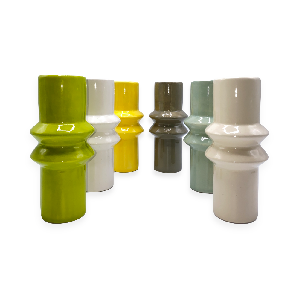 Candelabro de cerámica esmaltada, diseño geométrico para una vela. Volumen contenido, presencia serena. Para rincones que buscan equilibrio.