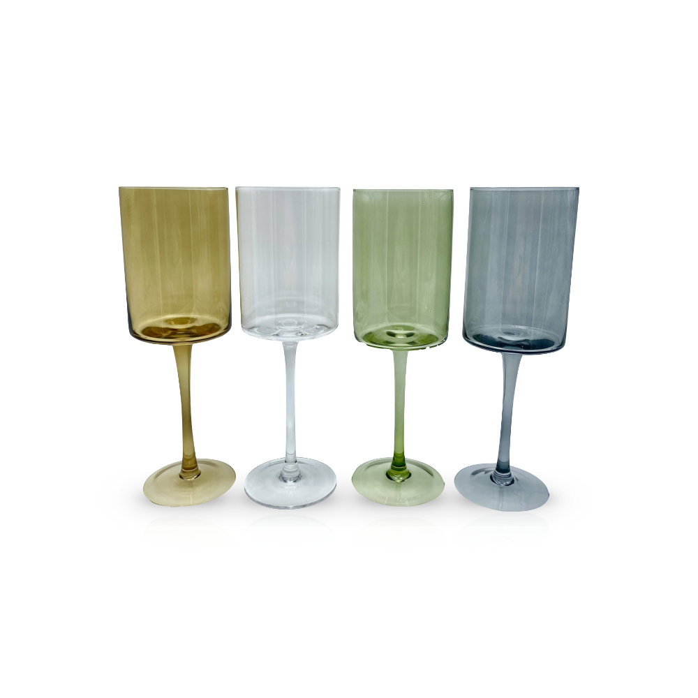 Copa de vidrio en suaves tonos con diseño de líneas rectas y tallo alto. Una pieza sencilla y moderna para servir vino o agua, ideal para darle un toque de color natural a tu mesa de todos los días.
