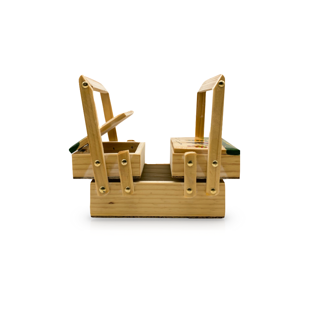 Costurero elaborado en madera de pino y pintado a mano, con un diseño artesanal y funcional, es ideal para organizar hilos, agujas y otros accesorios de costura, añadiendo un toque rústico y colorido a tus espacios.