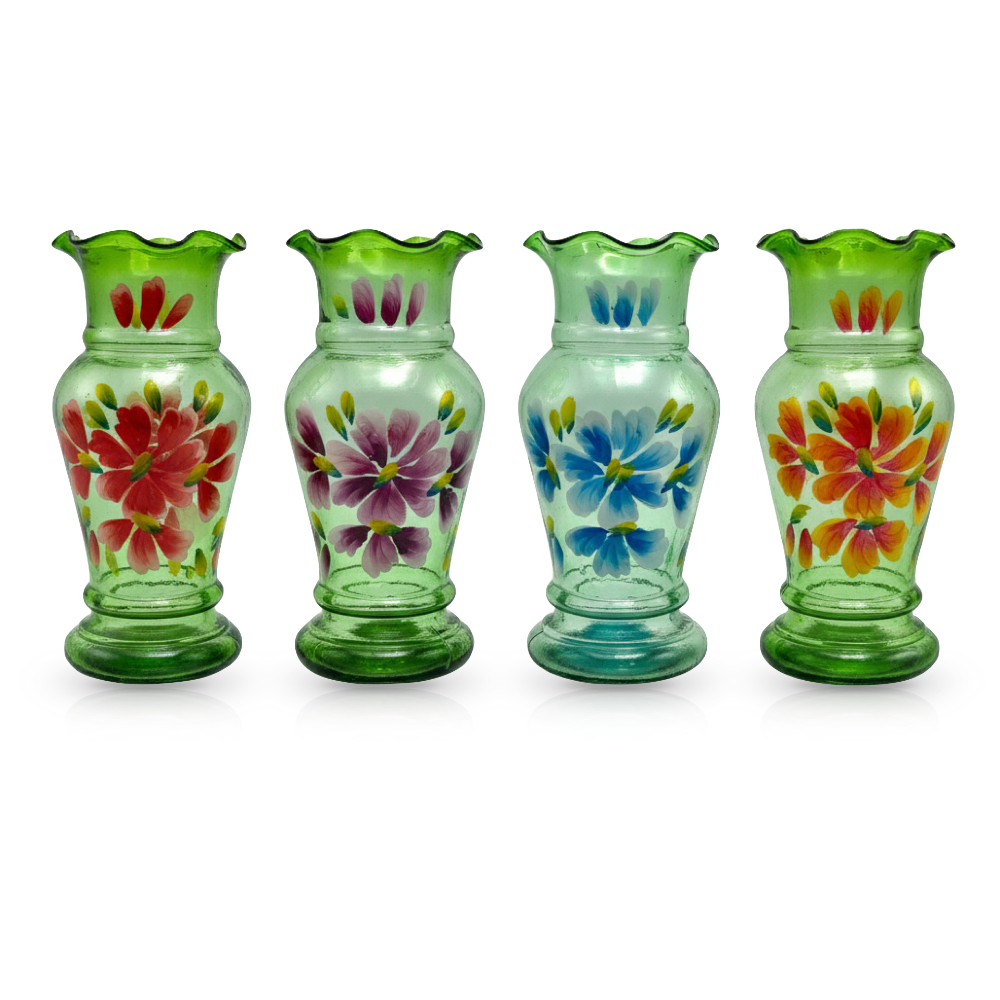 Florero de vidrio soplado en tono verde con flores pintadas a mano. Una pieza de silueta clásica y borde ondulado que recupera la tradición del cristal artesanal. Su diseño sencillo y colorido lo hace ideal para flores frescas en el centro de la mesa o en cualquier rincón que necesite un detalle auténtico.