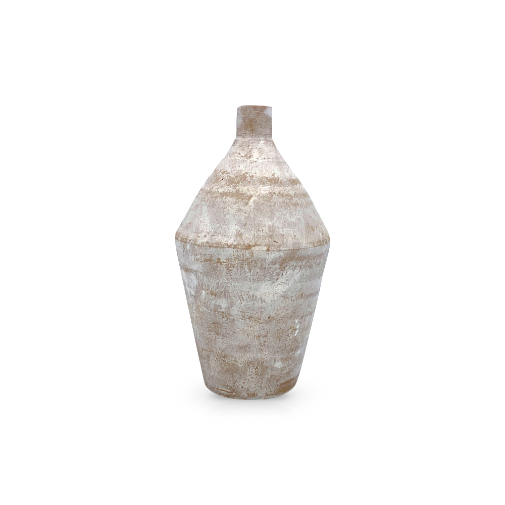 Florero de barro artesanal con silueta cónica y acabado blanco rústico. Una pieza de diseño sólido y textura natural, ideal para lucir ramas secas o como objeto decorativo por sí solo. Sencillez y carácter honesto para cualquier espacio de tu casa.