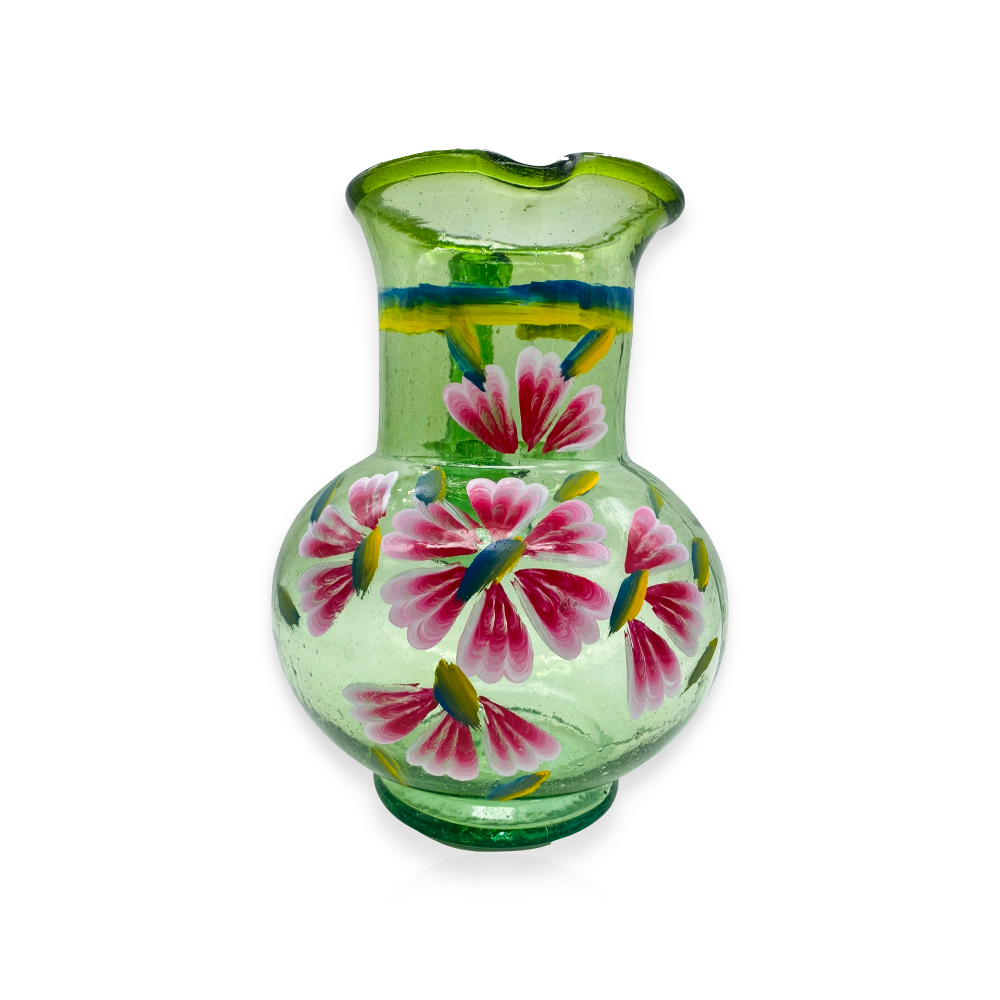 Jarra de vidrio soplado en color verde con flores pintadas a mano. Tiene una silueta redondeada y un borde ondulado que resalta su fabricación artesanal. Es una pieza resistente y con personalidad, ideal para servir agua o bebidas frescas al centro de la mesa de forma sencilla y honesta.