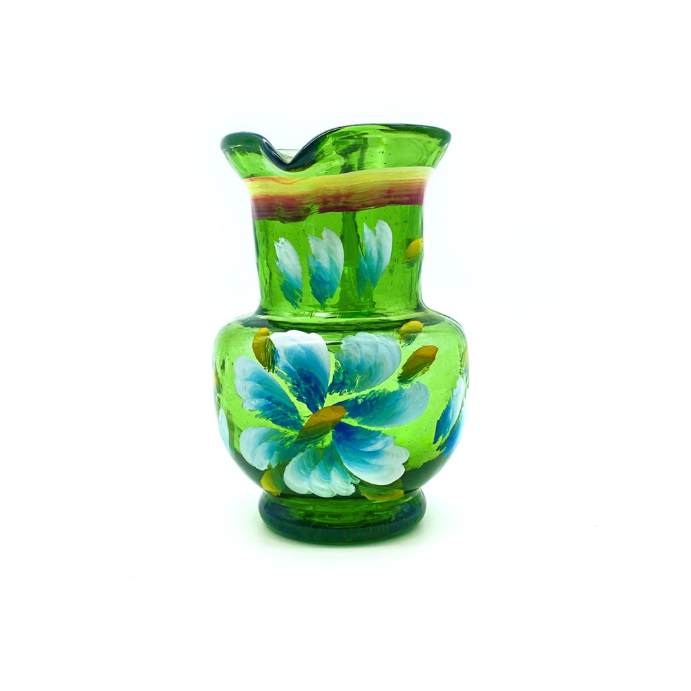 Jarra artesanal mini de vidrio soplado en color verde con alegres flores pintadas a mano. Una pieza compacta y llena de color que resalta por su técnica tradicional y silueta clásica. Ideal para servir leche, miel o salsas en la mesa, aportando un detalle vibrante y honesto a cualquier ocasión.