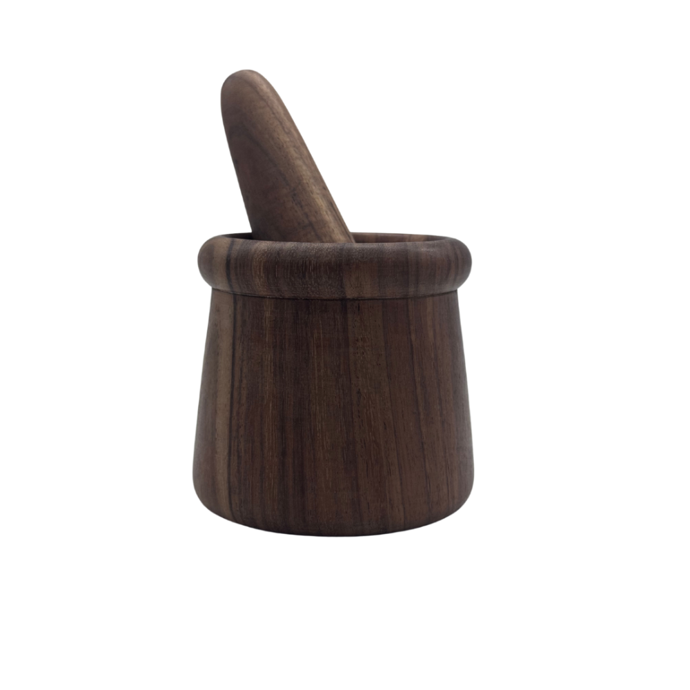 Este mortero está tallado a mano en madera de tzalam, elaborado en Mérida, Yucatán. Incluye un vaso con un tecolote, perfecto para moler especias, hierbas o preparar salsas con un toque artesanal.