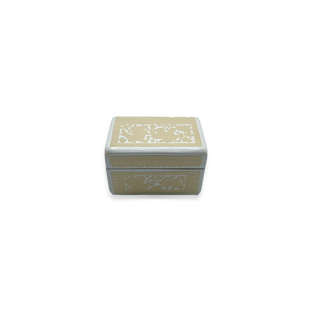 Caja miniatura hecha y decorada a mano en Olinalá, Guerrero. Misma laca tradicional y motivos dorados y florales en formato reducido, ideal para pequeños objetos y como detalle ornamental en cualquier espacio.