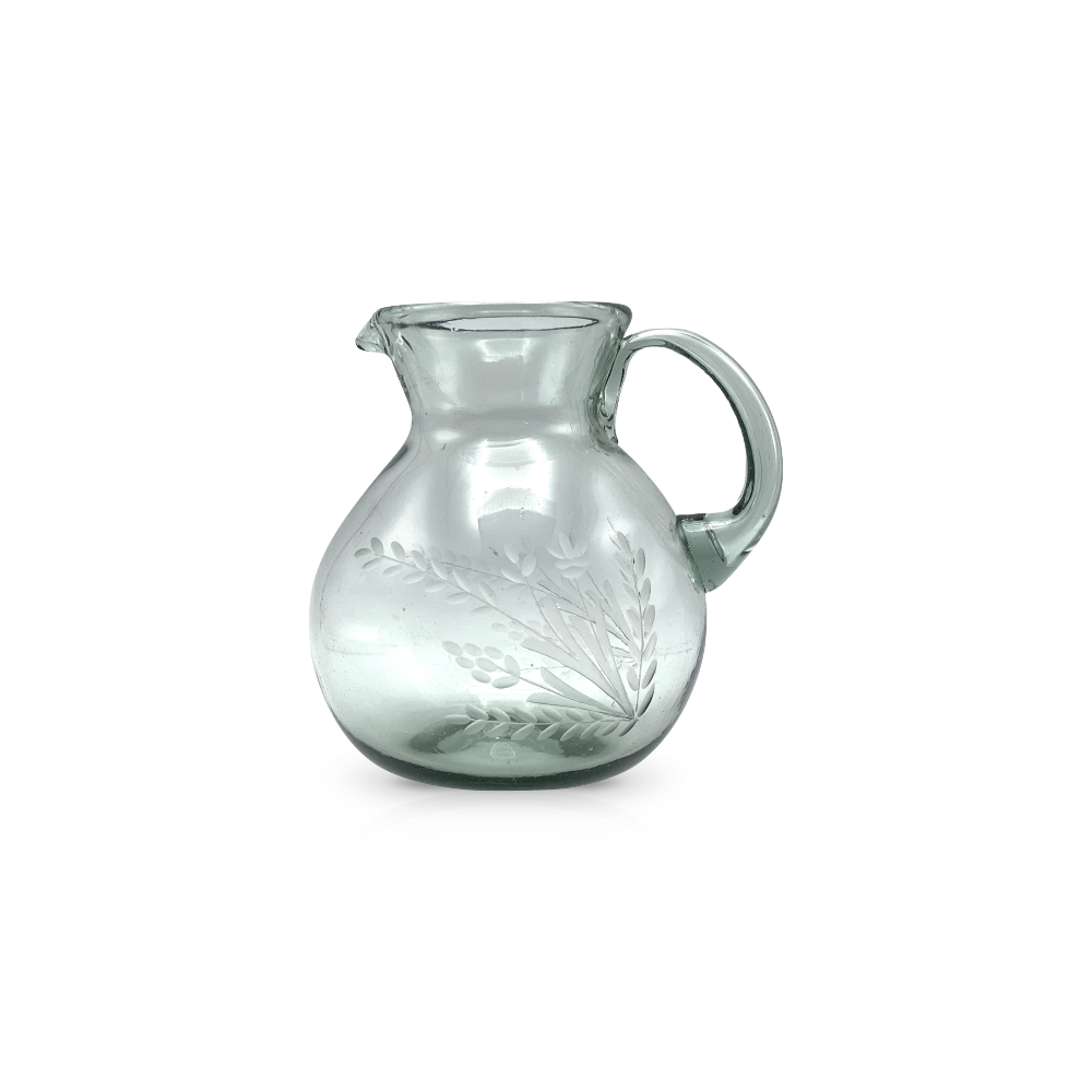 Jarra de vidrio soplado con el tradicional tallado de pepita hecho a mano. Una pieza de silueta redondeada y transparente que resalta por la delicadeza de sus motivos botánicos grabados directamente sobre el cristal. Por su tamaño, es ideal aportando un detalle clásico y distinguido a tu mesa de forma sencilla.