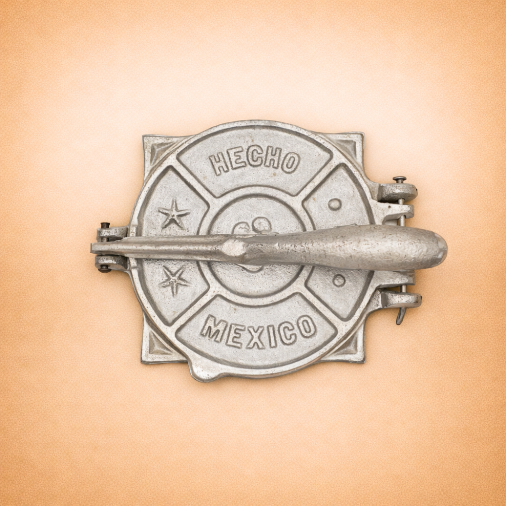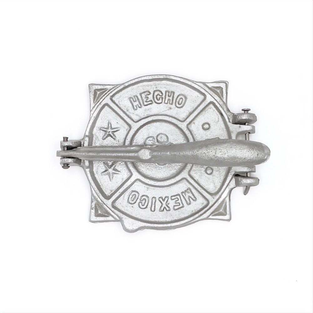 Prensa manual para tortillas elaborada en aluminio. Diseño clásico y duradero, ideal para preparar tortillas de forma práctica y uniforme.